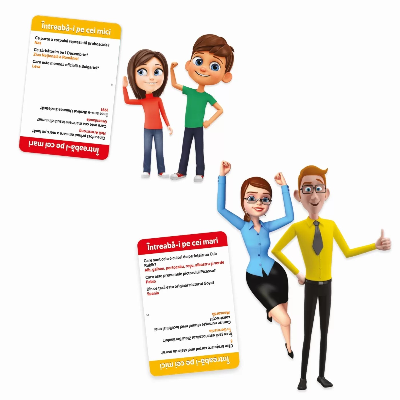 Cel mai distractiv joc de cunostinte generale pentru copii si parinti! Cu doua categorii de intrabari, familia este gata de confruntare. Raspunzand la intrebari de cultura generala, copiii au sansa de a demonstra ca oul e mai destept decat gaina! Prin raspunsuri corecte la intrebarile de pe cartonasele de joc, fiecare echipa va inainta pe tabla de joc. Aveti grija la pozitiile BONUS sau PEDEAPSA, pentru ca va pot ajuta sa inaintati, sau va pot intoarce cateva pozitii pe tabla de joc. Echipa care care ajunge prima la linia de Finish castiga! Jocul contine: tabla de joc, 110 cartonase de joc cu 660 de intrebari, 2 pioni si instructiuni de joc. Varsta 7+. Jucatori 2+.
