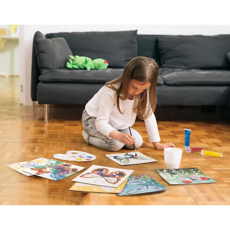 Coloreaza desenele cu acuarele si creeaza opere de arta unice. Contine sabloane cu fluturi: 2 sabloane semi-colorate, 5 sabloane albe, 3 culori de acuarela, 1 paleta, 1 pensula si un ghid detaliat pentru a va ghida in procesul de colorare a desenelor.
