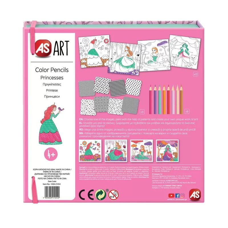 Set de pictura cu modele pentru a crea propria ta opera de arta unica. Alege un model si picteaza printesele tale preferate cu creioane colorate. Diferitele modele si culori va sporesc imaginatia pentru a crea o varietate de modele. Setul promoveaza abilitatea tactila dar si creativitatea-imaginatia. Contine 10 imagini semicolorate pretiparite, 2 coli cu modele, 8 creioane in diferite culori si un ghid de colorat detaliat pas cu pas pentru a obtine un rezultat cat mai deosebit.