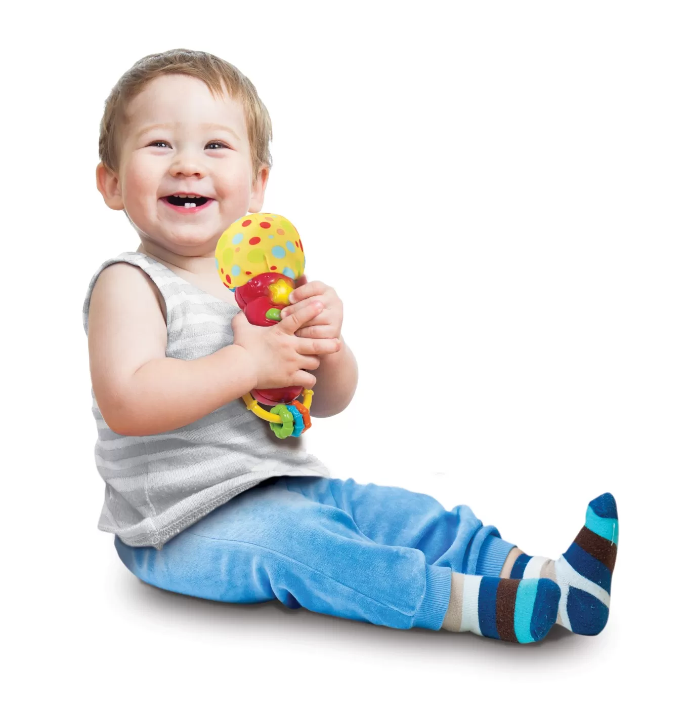 Descoperiti microfonul interactiv pentru bebelusi, o jucarie captivanta si educativa conceputa special pentru cei mici, incepand cu varsta de 3 luni. Microfonul pentru bebelusi este dotat cu lumina intermitenta care capteaza imediat atentia copiilor, transformand fiecare moment de joaca intr-o experienta magica. Butonul activeaza efecte sonore distractive, aducand un plus de farmec fiecarei sesiuni de joaca. Sunetele variate si placute stimuleaza simtul auditiv al copiilor, incurajandu-i sa interactioneze si sa descopere noi modalitati de a se juca. Microfonul este echipat si cu inele rotative texturate, care adauga o dimensiune tactila jucariei. Aceste inele sunt usor de prins si de rotit, stimuland dezvoltarea abilitatilor motorii fine si a coordonarii mana-ochi. Acest microfon este un instrument excelent pentru dezvoltarea timpurie a copiilor. Designul colorat si luminile intermitente contribuie la dezvoltarea simtului vizual si la mentinerea interesului celor mici pentru perioade lungi de timp. Recomandat pentru copiii cu varsta de cel putin 3 luni, acest microfon interactiv este perfect pentru a sustine dezvoltarea armonioasa a bebelusilor.