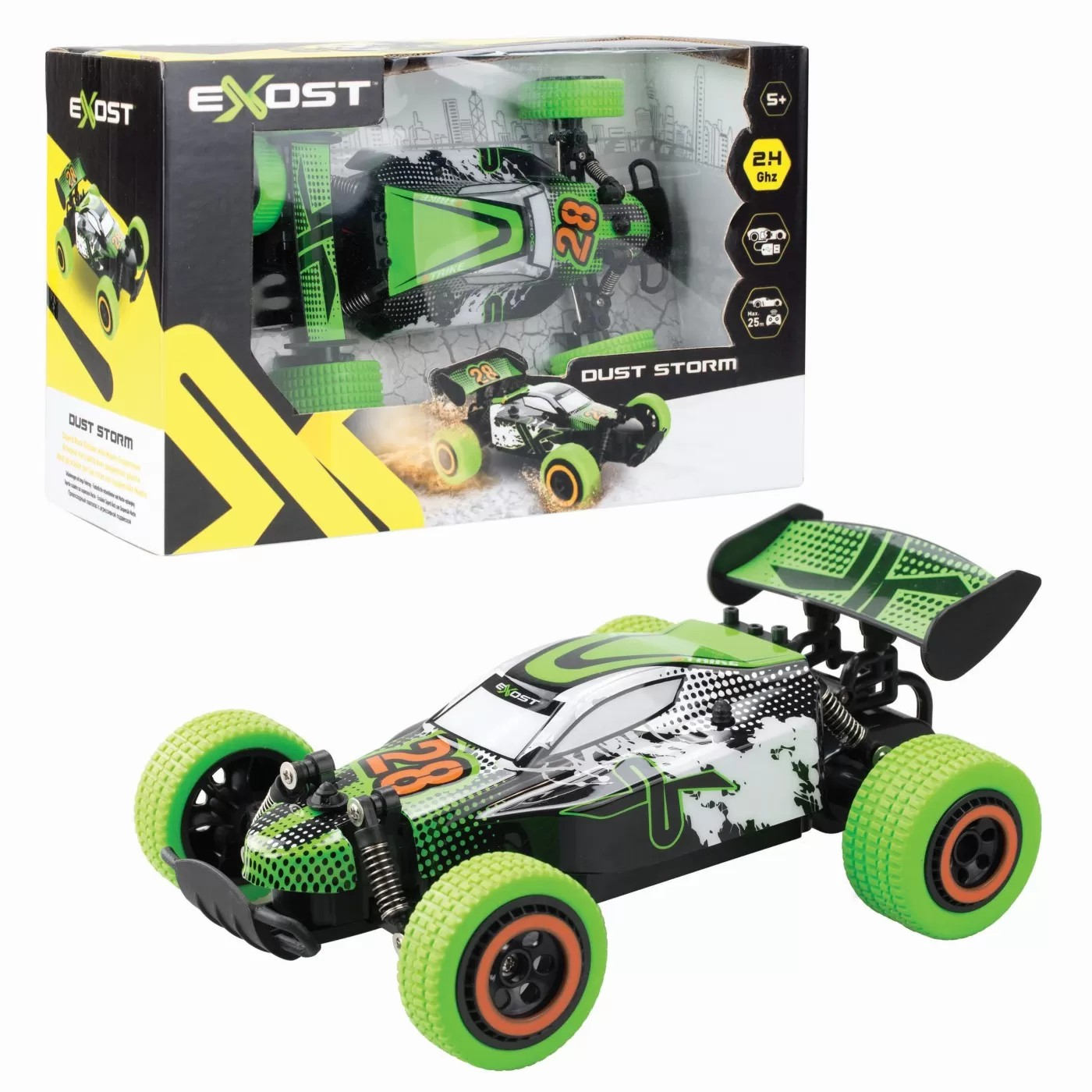 Conduceti noul Exost Dust Storm cu anvelopele off-road! Depaseste toate obstacolele cu suspensia sa independenta. Are o acceleratie si un sistem de directie incredibil, putand fi condus pe orice tip de teren. Este construita la o scara de 1:18 si are tehnologie de 2,4 Ghz pentru a incuraja mai multi jucatori pentru si mai multa distractie! Functioneaza cu baterii: vehicul - 4xAA nu sunt incluse, telecomanda 2xAA nu sunt incluse, viteza maxima 8km/h, distanta 20m, caroserie demontabila.Varsta recomandata 5 ani+.