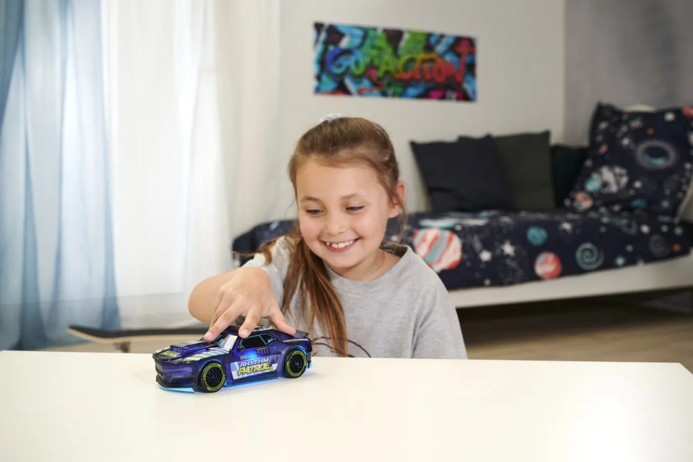 Masina Dickie Toys Rhythm Patrol 20 cm negru cu lumini si sunete. Chiar si masinile legii pot imbraca diferite forme. Avand un design fantezist, masina se transforma rapid dintr-o masina clasica de politie, intr-o super-masina de curse. Motorul special, cu frictiune, sirena precum si lumina schimbatoare atrage atentia tuturor copiilor. Prin apasarea butonului, masina straluceste in noapte. Aceasta isi schimba culorile si sunetele.