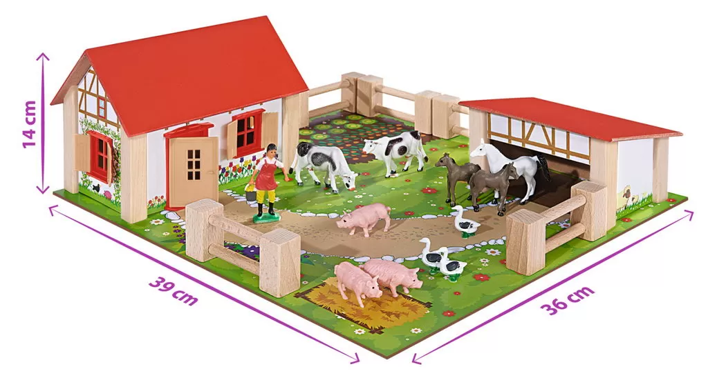 -Ferma este un loc minunat unde animalele pot trai in armonie. -Baza colorata cu pajiste,legume si flori, grajd, ferma si o multime de animale diferite le ofera micilor agricultori posibilitatea de a da frau liber imaginatiei, cu jocuri de rol incitante.Ferma are 21 de piese. -Varsta recomandata 3 ani+. EICHHORN 100004304 Avertisment Contraindicat copiilor mai mici de 3 ani. Jucaria poate contine piese mici, care se pot inghiti sau inhala, existand pericolul de sufocare. Nu lasati ambalajele jucariilor la indemana copiilor. Indepartati orice ambalaj al jucariei inainte de a o oferi copilului. Va recomandam sa supravegheati copilul in timp ce se joaca cu produsul. Pastrati instructiunile si etichetele pentru referinte viitoare. Pastrati jucaria departe de foc.Feriti jucaria de temperaturi ridicate si umiditate.